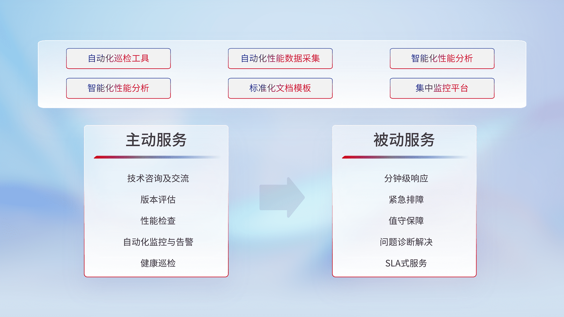 智能化工具和标准化文档,,,,保障服务质量,,,,提供主动服务(包含技术咨询、、、、版本评估、、、性能检查、、、自动化监控与告警、、、健康巡检)和被动服务包含(分钟级响应、、、、紧急排障、、、值守保障、、问题诊断解决、、SLA服务)。。。