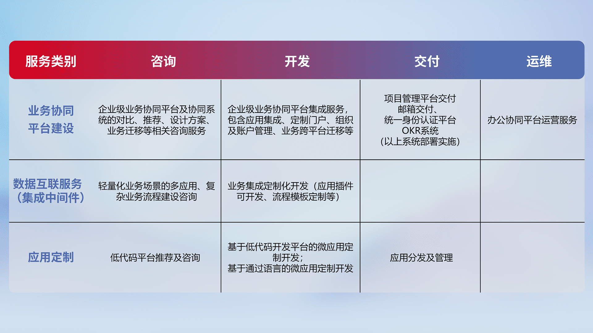 针对钉钉、、企微、、、IDaas等平台级产品提供产品的规划、、方案、、、交付、、定制化开发等服务,,,实现如统一协同办公、、、、智能客户服务、、混合会议管理、、、、智能数据查询、、等业务场景,,,实现数字化转型。。。
